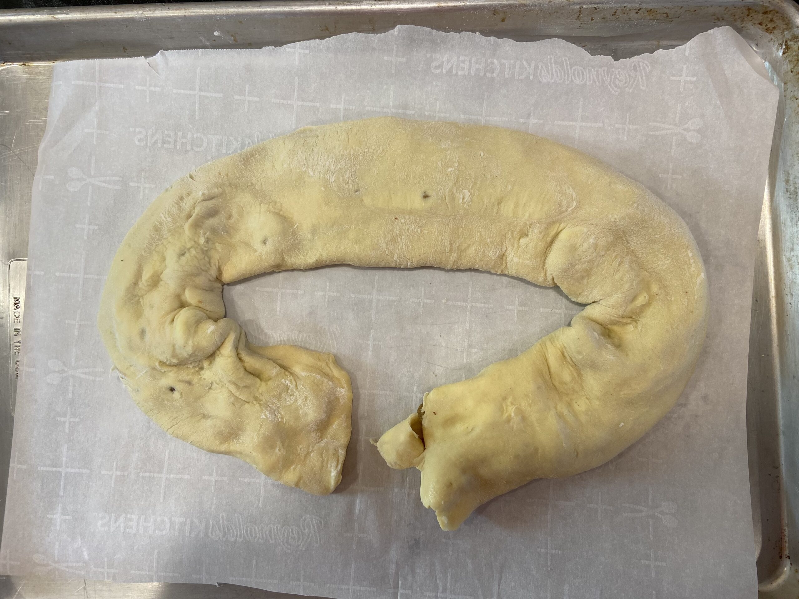 - Fold one end of kringle into other end, to create continuous oval, brushing folded-in edges with water or egg white, and pressing and pinching to seal ends.